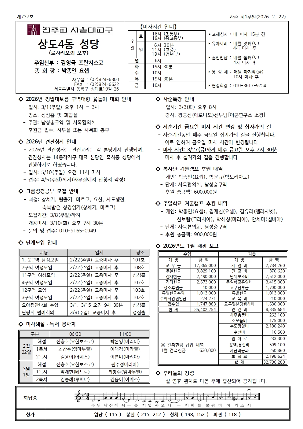 주 보 서울주보 상도4동 본당 지면 서울 주보 바로가기 제737호 2026. 02. 22 사순 제1주일 작성자 상도4동성당 작성일 2026-02-26 17:15 조회 35 좋아요 0 싫어요 0 인쇄 « 제736호 2026. 02. 15 연중 제6주일 제738호 2026. 03. 01 사순 제2주일 » 목록보기 Powered by KBoard 관리자 로그인